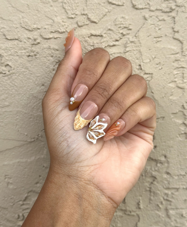 Seashell-inspired embellishments and neutral tones bring a touch of luxury to beach nails. The sculpted shells and pearls make this design stand out.